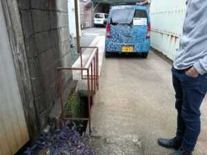 側溝の柵をとって、鉄板の蓋をのせたら車が通りやすくなるかも?ということで現場を確認しました。